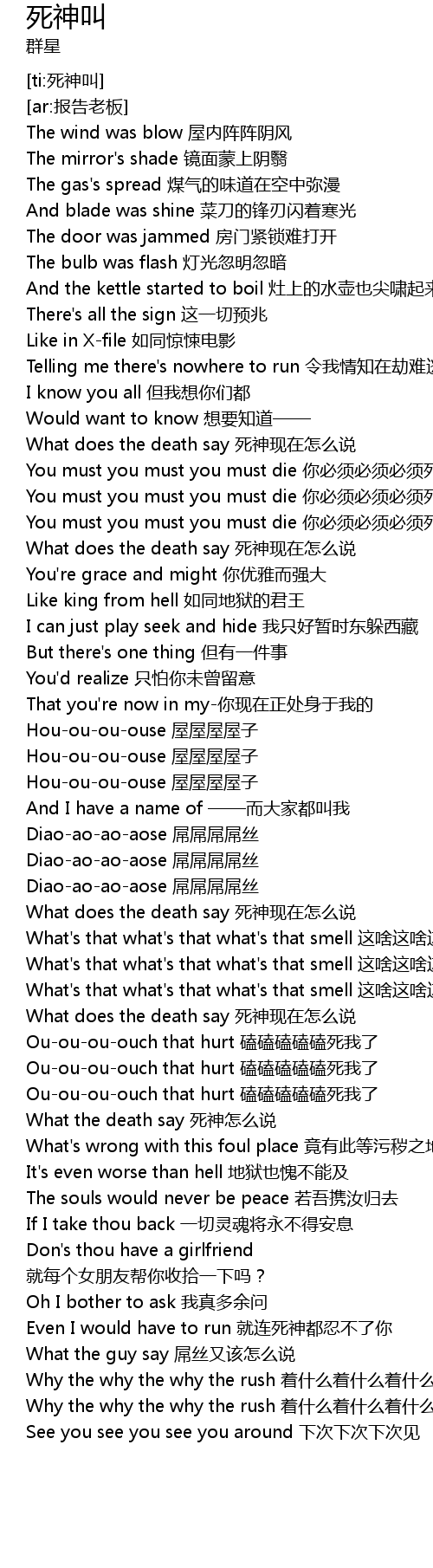 | [00:43.590] | What does the death say sǐ shén xiàn zài zěn me shuō |