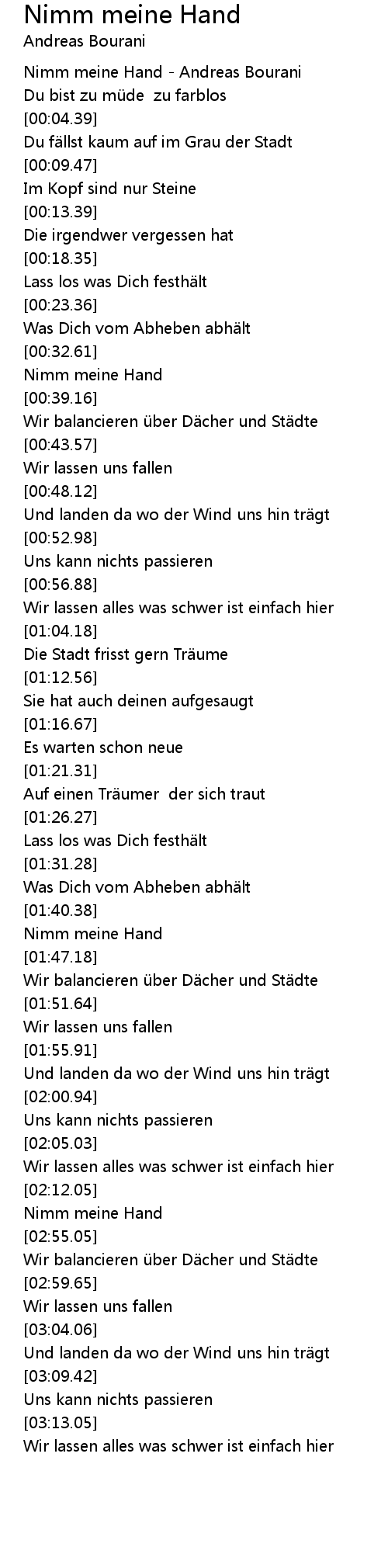 | [00:00.47] | Nimm meine Hand Andreas Bourani |