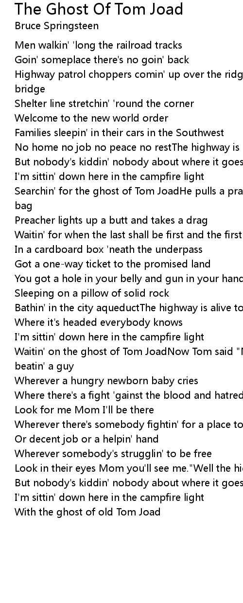 Waitin' on the ghost of Tom JoadNow Tom said "Mom, wherever there's a cop beatin' a guy |