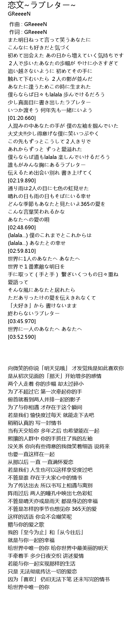 | [03:29.500] | 「大好き」から 書けないまま 終わらないラブレター |