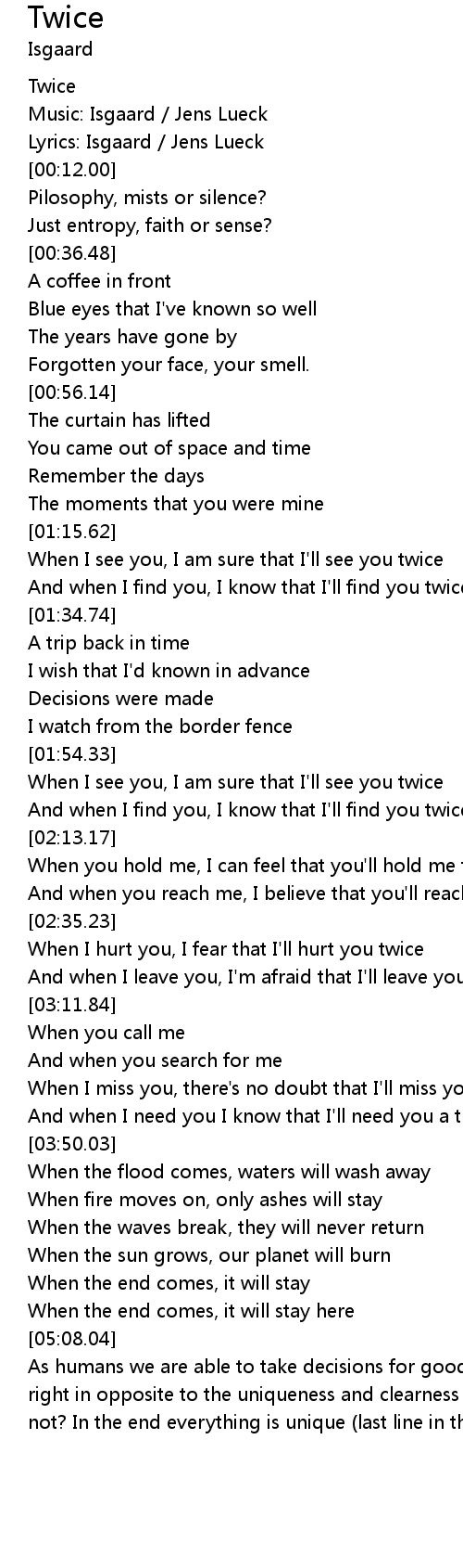 | [02:03.91] | And when I find you, I know that I'll find you twice |