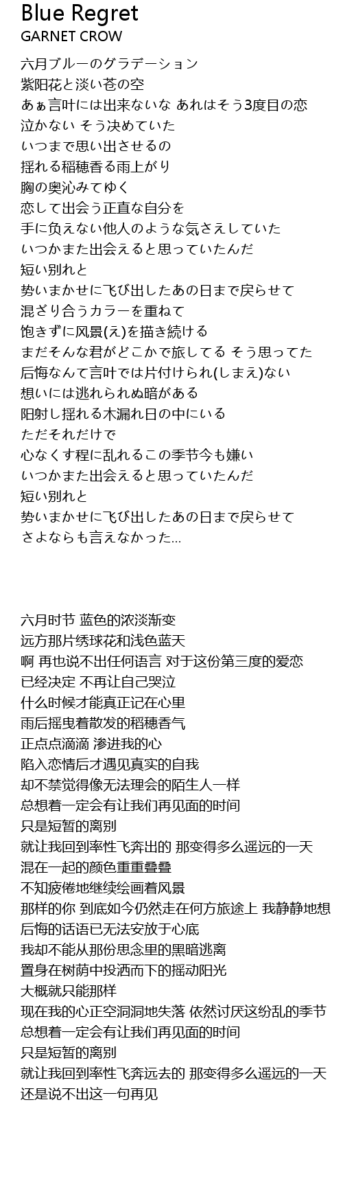 | [02:26.370] | 后悔なんて言叶では片付けられ(しまえ)ない |