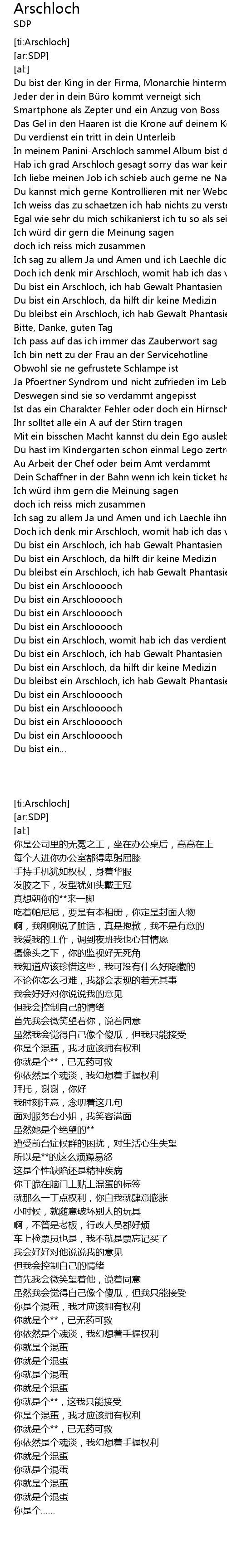 | [02:02.43] | Du bleibst ein Arschloch, ich hab Gewalt Phantasien |