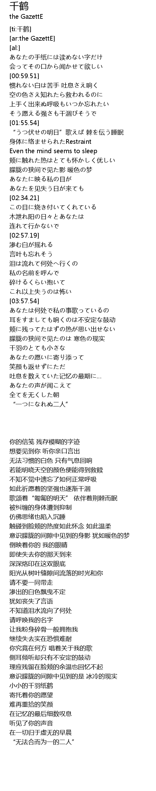 | [01:58.97] | “うつ伏せの明日”歌えば 棘を伝う睡眠 |