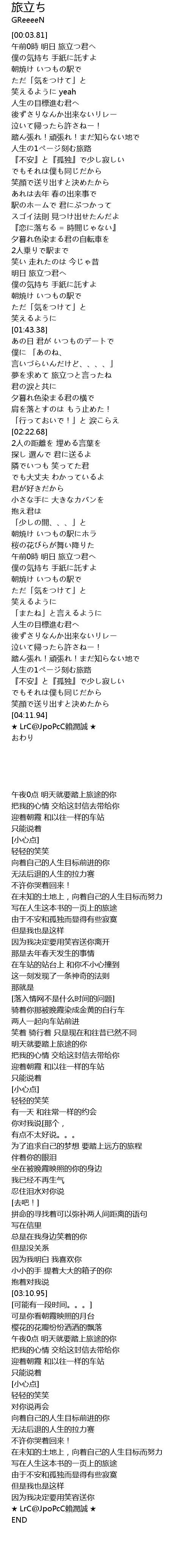 | [00:04.81] | 午前0時 明日 旅立つ君ヘ |