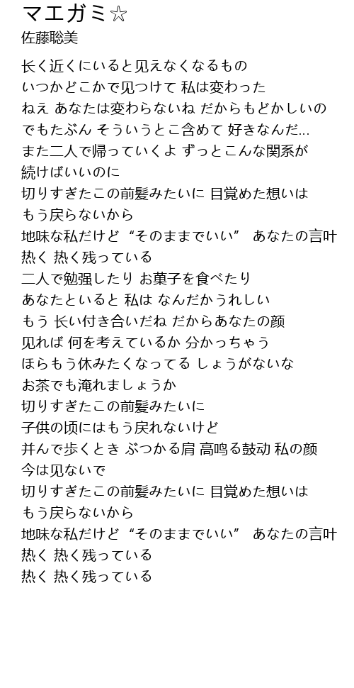 | [00:49.63] | 切りすぎたこの前髪みたいに 目覚めた想いは もう戻らないから |