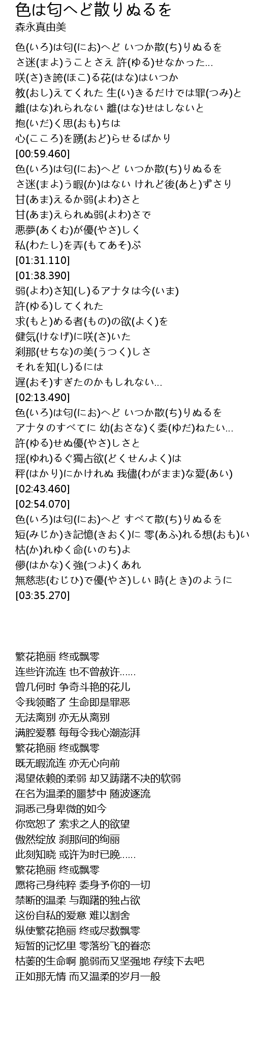 | [00:01.600] | 色(いろ)は匂(にお)へど いつか散(ち)りぬるを |