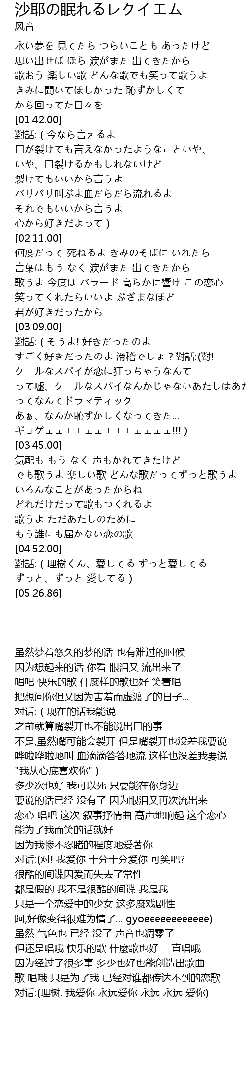 | [05:14.62] | 對話:(理樹くん、愛してる ずっと愛してる ずっと、ずっと 愛してる) |