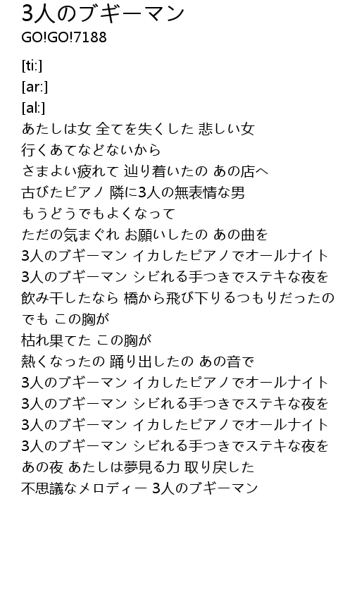 | [02:54.13] | 3人のブギーマン シビれる手つきでステキな夜を |