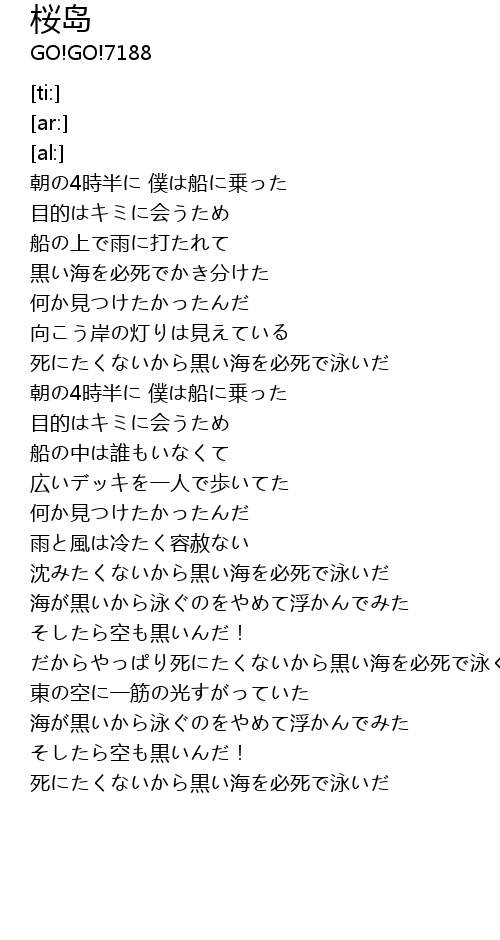 | [03:35.97] | 海が黒いから泳ぐのをやめて浮かんでみた |