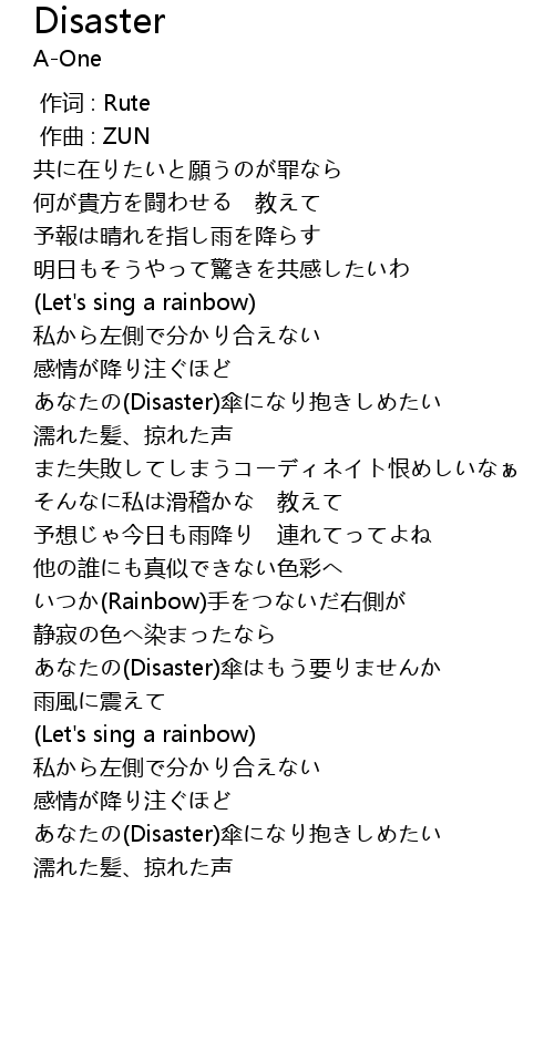 | [01:09.69] | あなたの(Disaster)傘になり抱きしめたい |