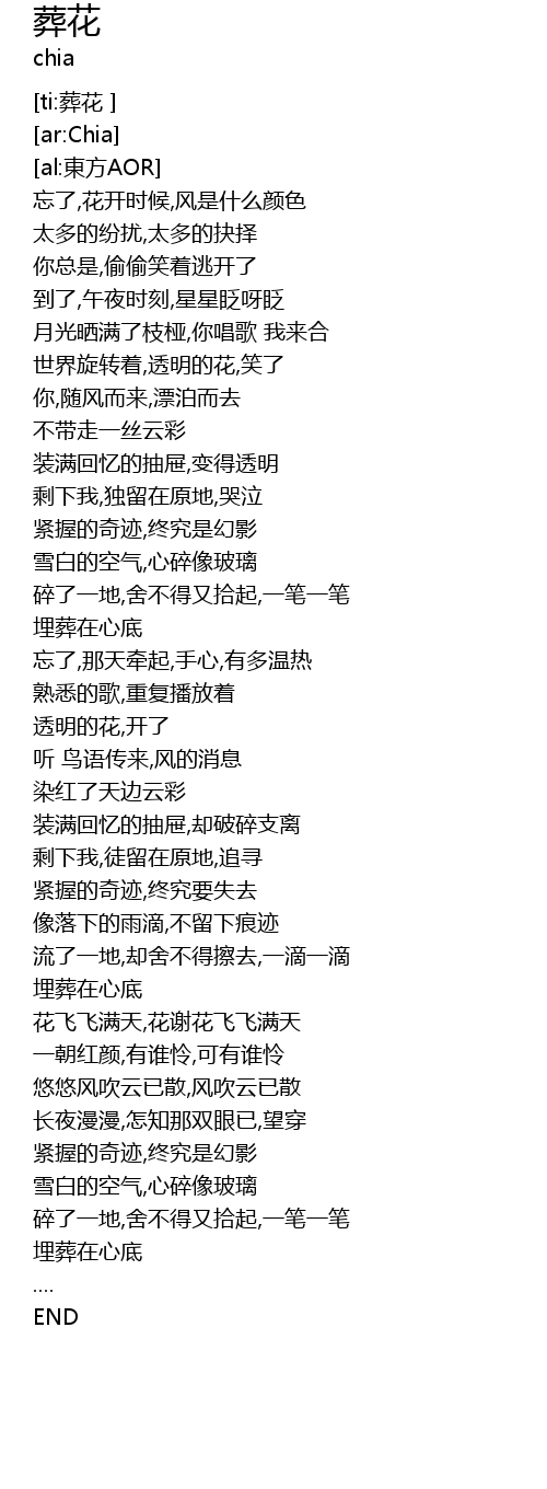 | [03:31.44] | huā fēi fēi mǎn tiān, huā xiè huā fēi fēi mǎn tiān |