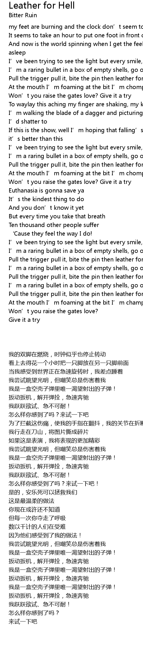 | [00:34.81] | Pull the trigger pull it, bite the pin then leather for hell run |