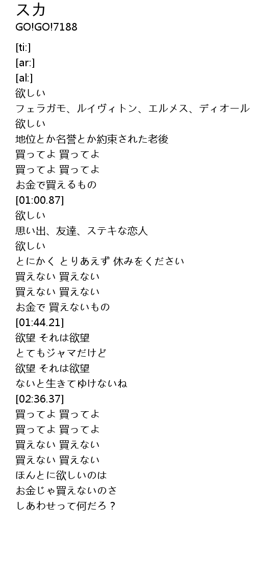 | [00:26.06] | フェラガモ、ルイヴィトン、エルメス、ディオール |