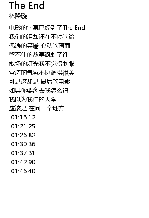 | [00:23.26] | diàn yǐng de zì mù yǐ jīng dào le The End |