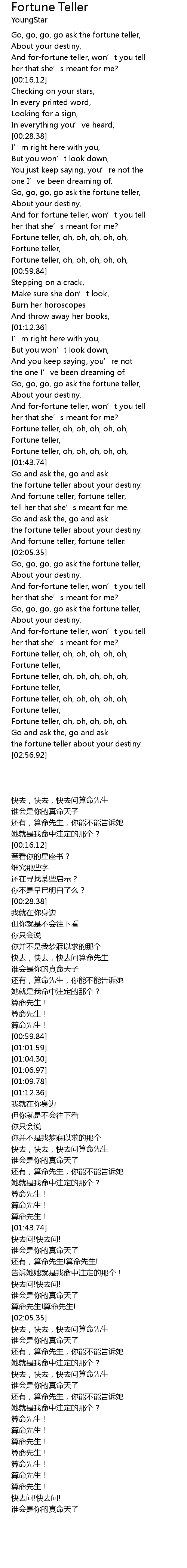 | [02:17.90] | Go, go, go, go ask the fortune teller, |