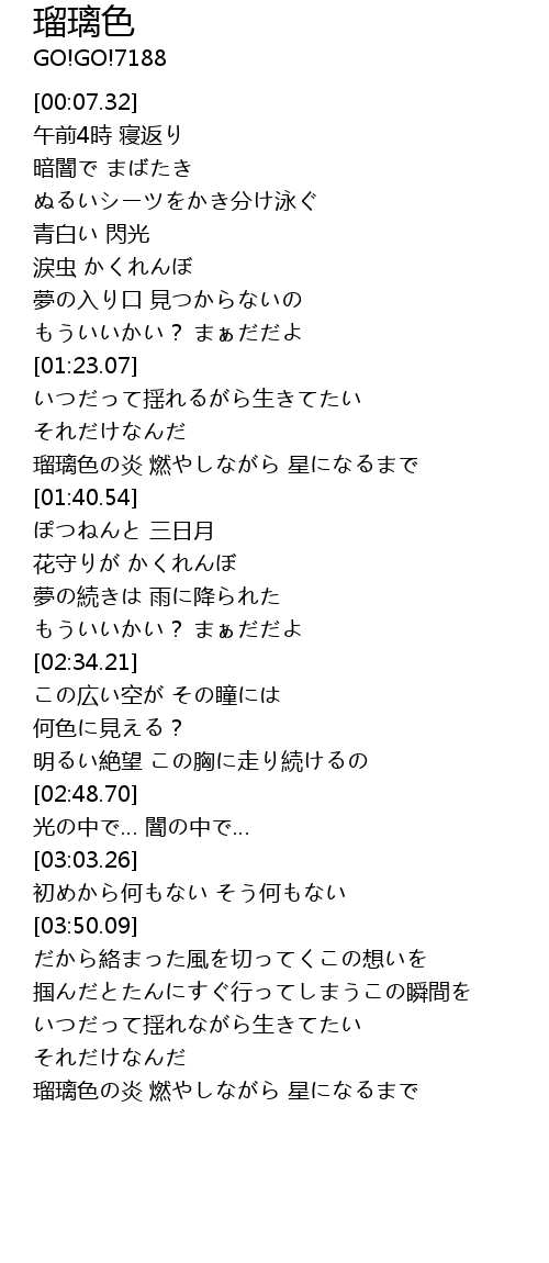 | [04:10.42] | 瑠璃色の炎 燃やしながら 星になるまで |