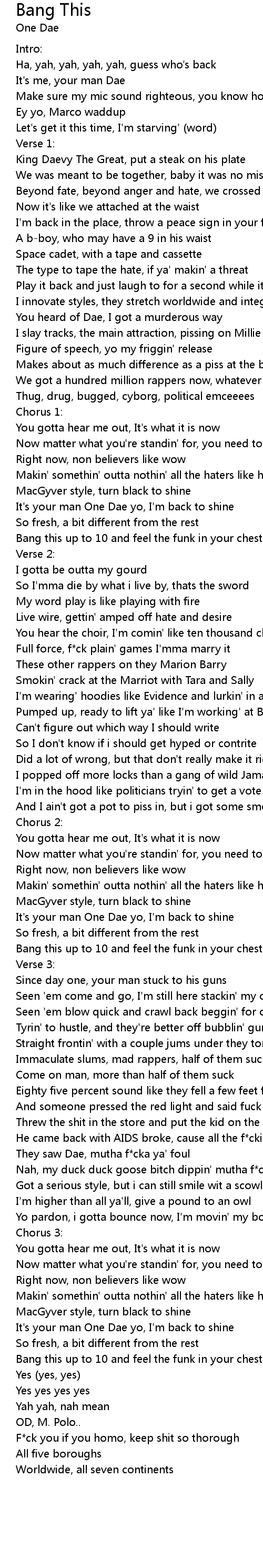 Yo pardon, i gotta bounce now, I'm movin' my bowels (one) |