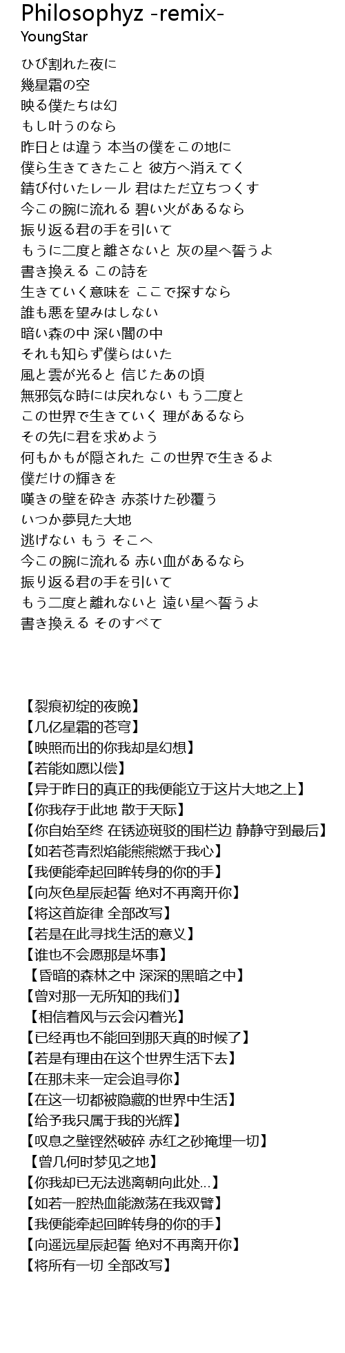 | [01:40.59] | もうに二度と離さないと 灰の星へ誓うよ |