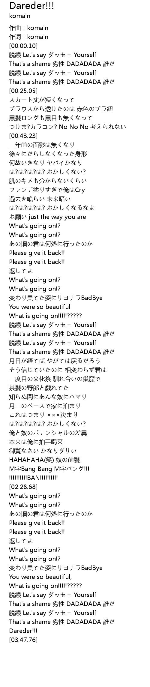 | [03:39.17] | That's a shame 劣性 DADADADA 誰だ |