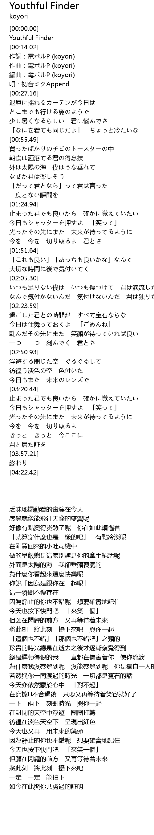 | [00:16.09] | 作詞:電ポルP (koyori) |