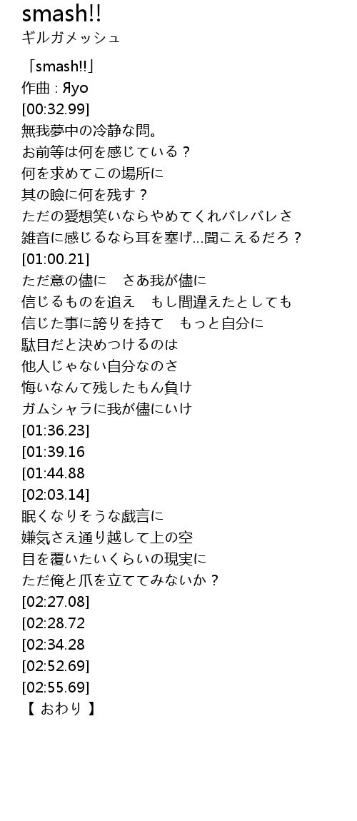 | [02:40.61][02:28.72] | 俺は同意が欲しいんじゃない 共感を歌え |