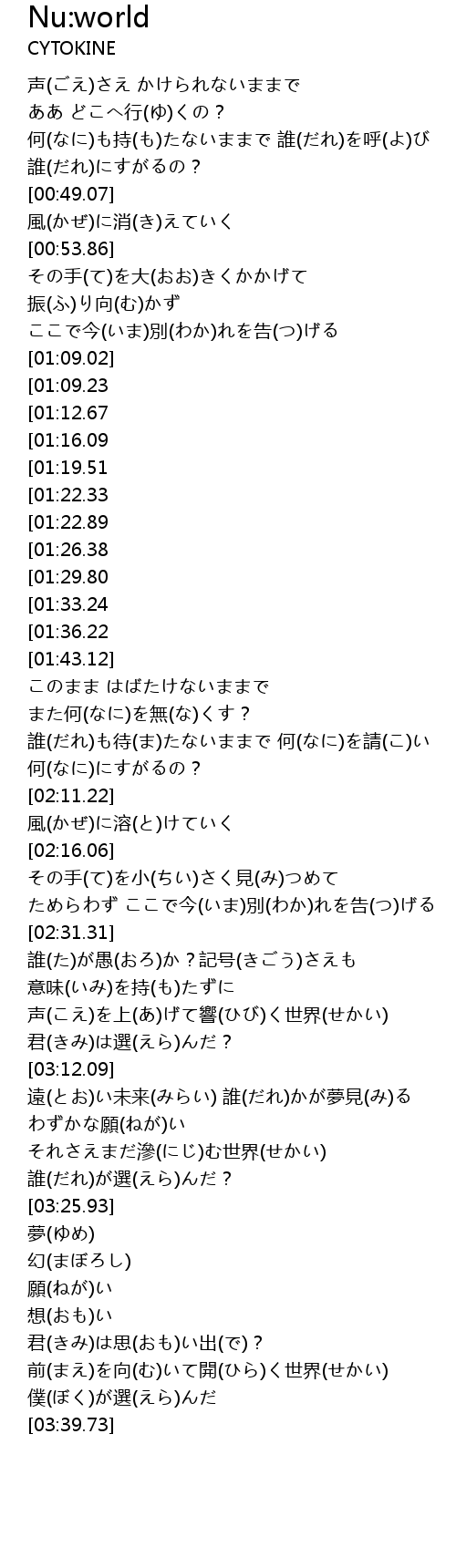 | [03:19.49] | それさえまだ滲(にじ)む世界(せかい) |