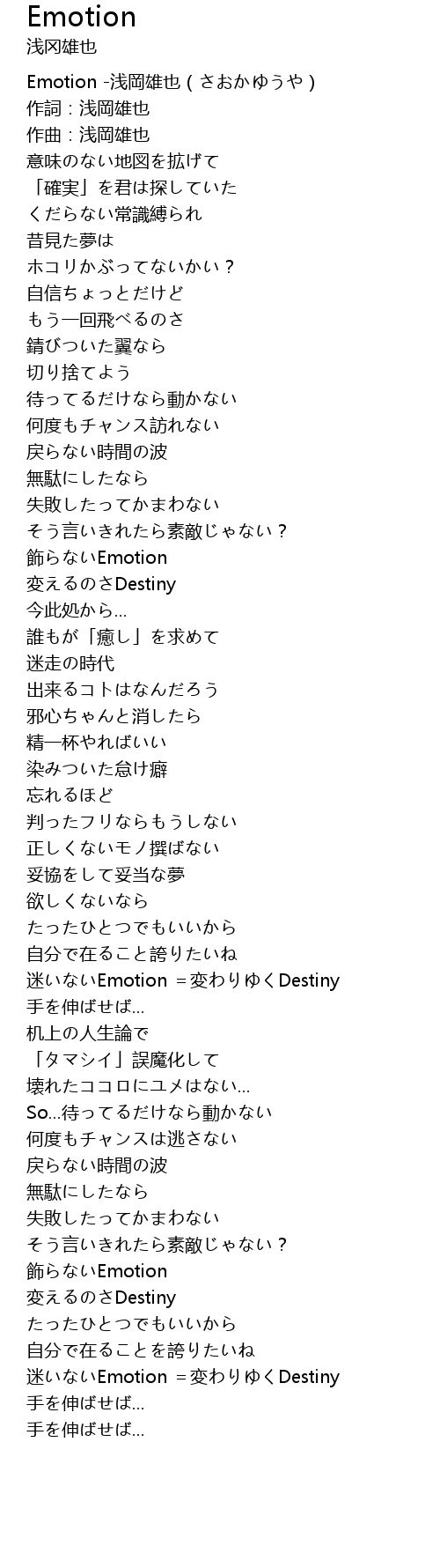| [00:00.00] | Emotion -浅岡雄也(さおかゆうや) |