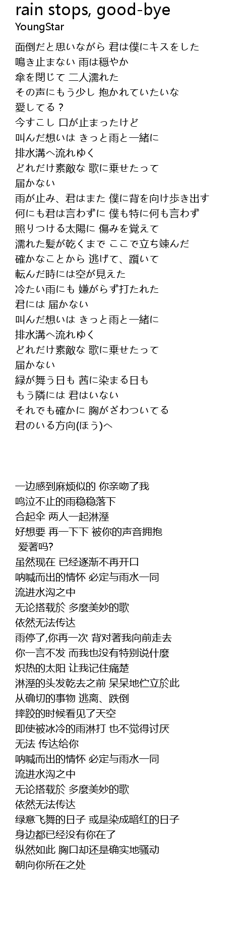 | [01:18.84] | 叫んだ想いは きっと雨と一緒に |