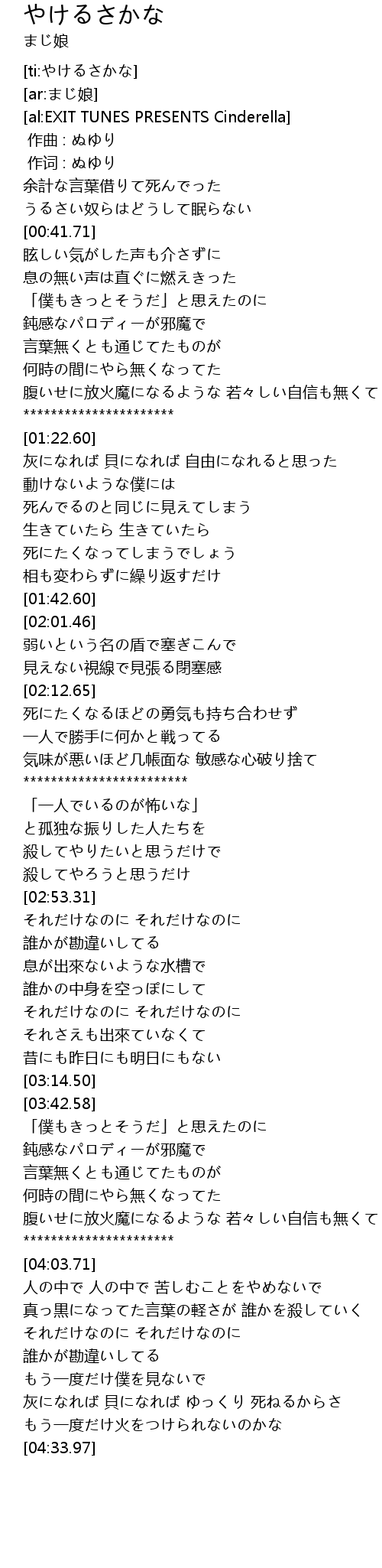 | [03:53.26] | 腹いせに放火魔になるような 若々しい自信も無くて |