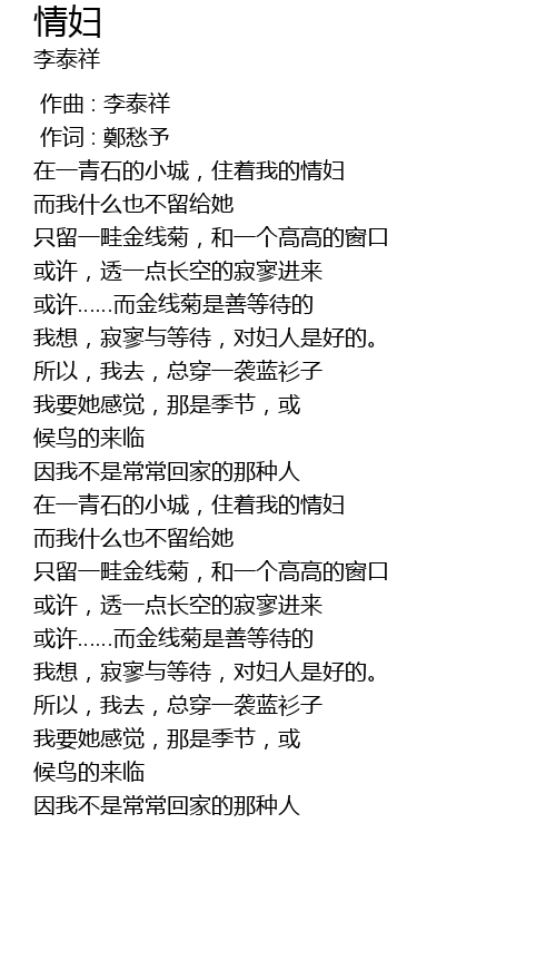 | [01:48.049] | 在一青石的小城,住着我的情妇 |