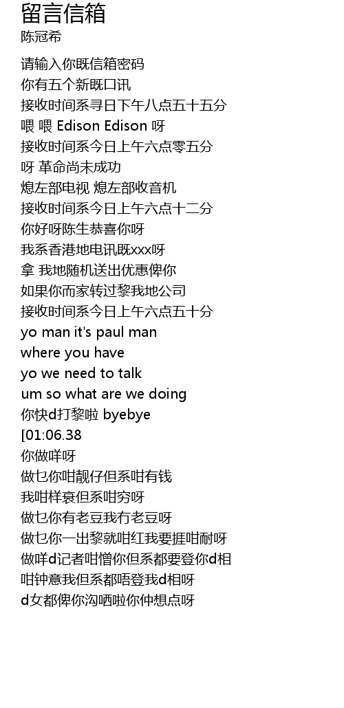 | [01:01.42][01:06.38] | 接收时间系今日上午六点五十四?喂 陈冠希 你做咩呀 |
