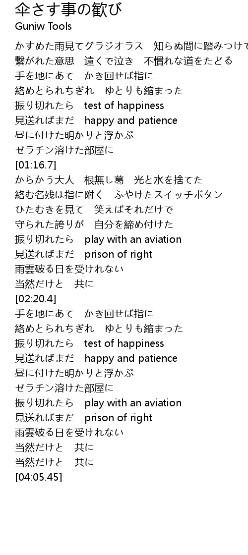 | [00:21.83] | かすめた雨見てグラジオラス 知らぬ間に踏みつけてた |