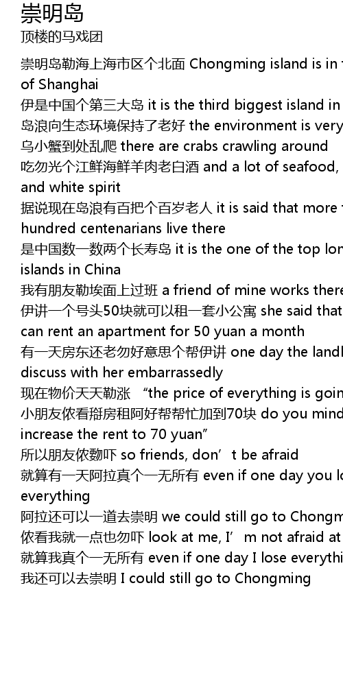 | [00:36.56] | chóng míng dǎo lēi hǎi shàng hǎi shì qū gè běi miàn Chongming island is in the north of Shanghai |