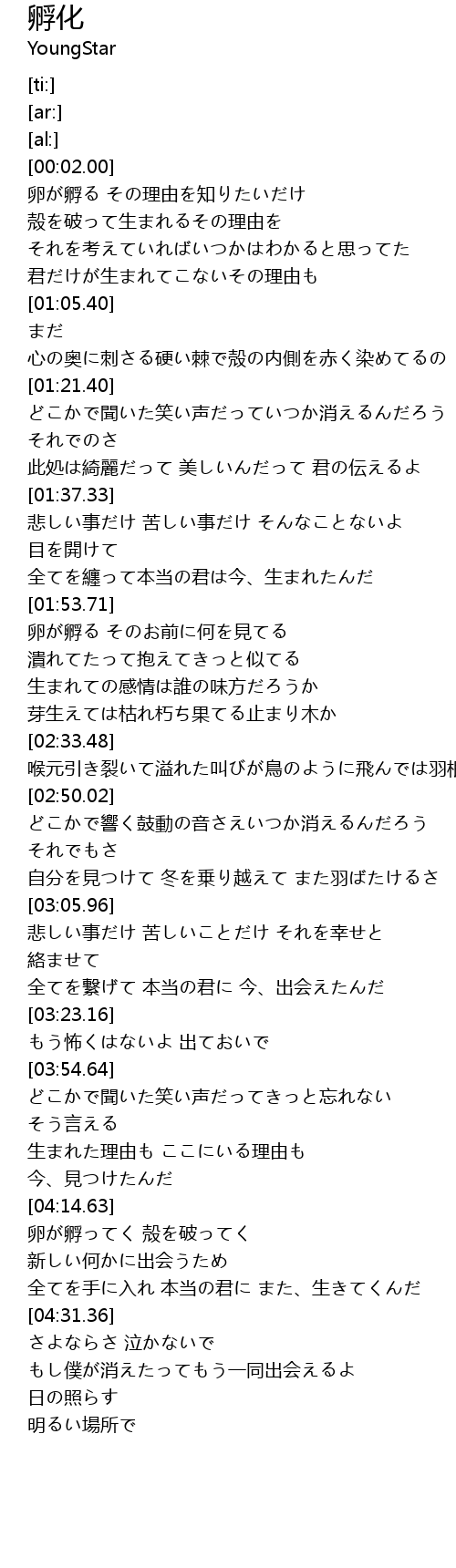 | [04:14.89] | 卵が孵ってく 殻を破ってく 新しい何かに出会うため |