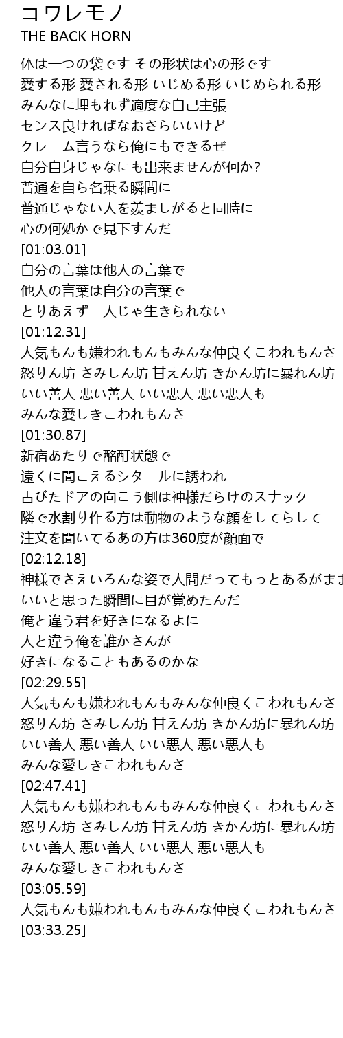 | [01:13.06] | 人気もんも嫌われもんもみんな仲良くこわれもんさ |