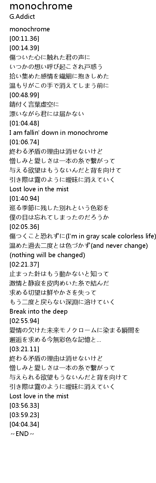 | [02:43.37] | もう二度と戻らない深淵に溶けていく |
