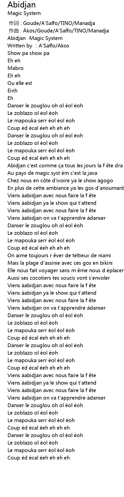 | [02:59.32] | Viens à abidjan on va t' apprendre à danser |
