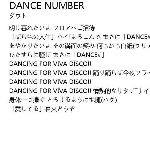 | 明け暮れたいよ フロアへご招待 「ばら色の人生」ハイ!よろこんで まさに「DANCE#」 あやかりたいよ その満面の笑み 何もかも白紙(クリア)に ひたすらに騒げ まさに「DANCE#」 | |