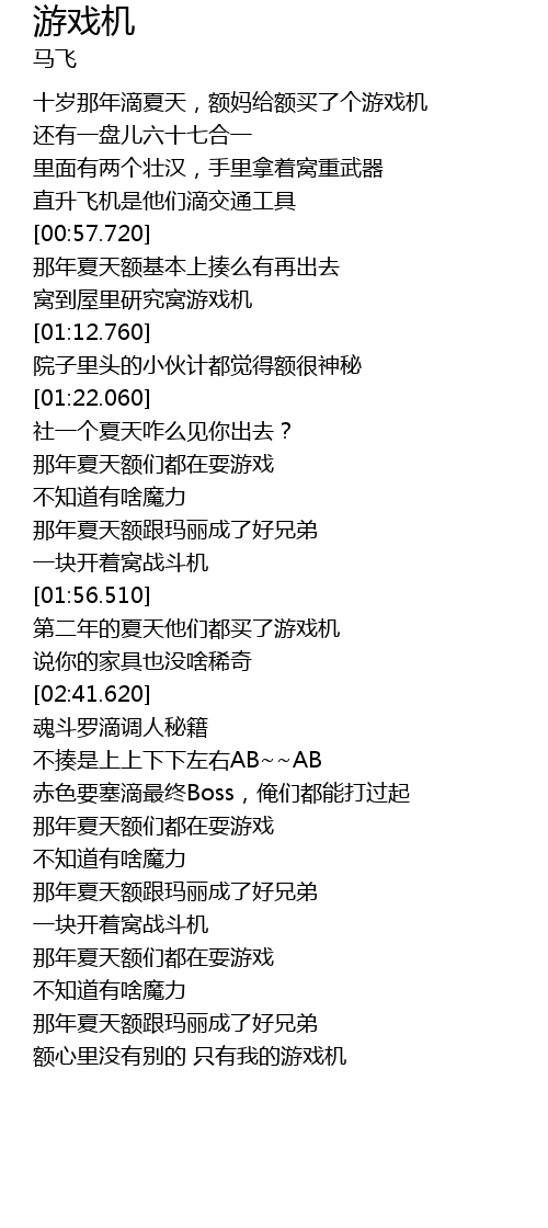 | [00:30.950] | 十岁那年滴夏天,额妈给额买了个游戏机 |