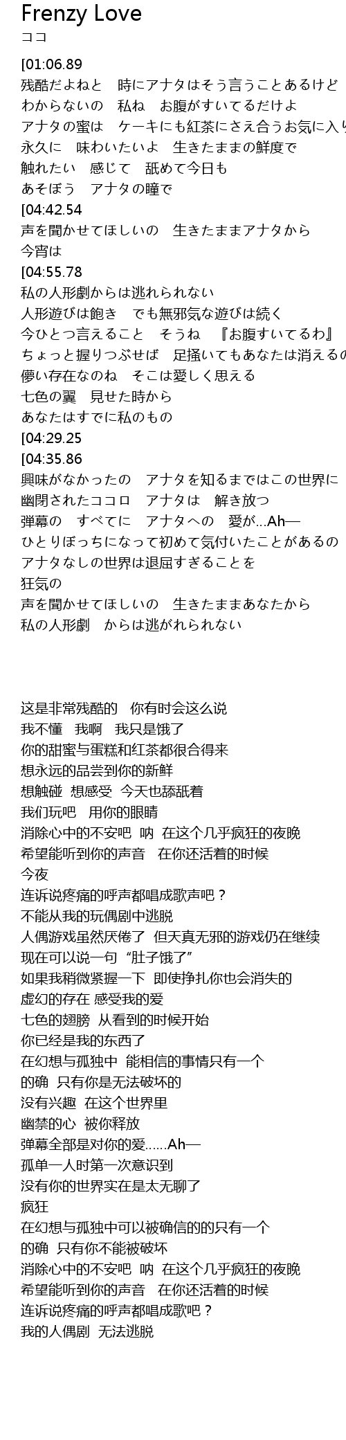 | [01:33.81][04:42.54] | 不安をぬぐってよ ねえ 気が狂いそうなの この夜は |