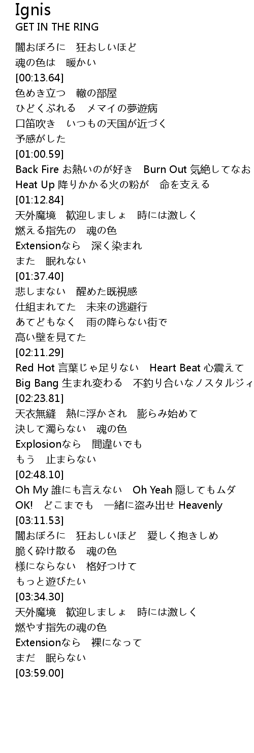 | [01:01.20] | Back Fire お熱いのが好き Burn Out 気絶してなお |
