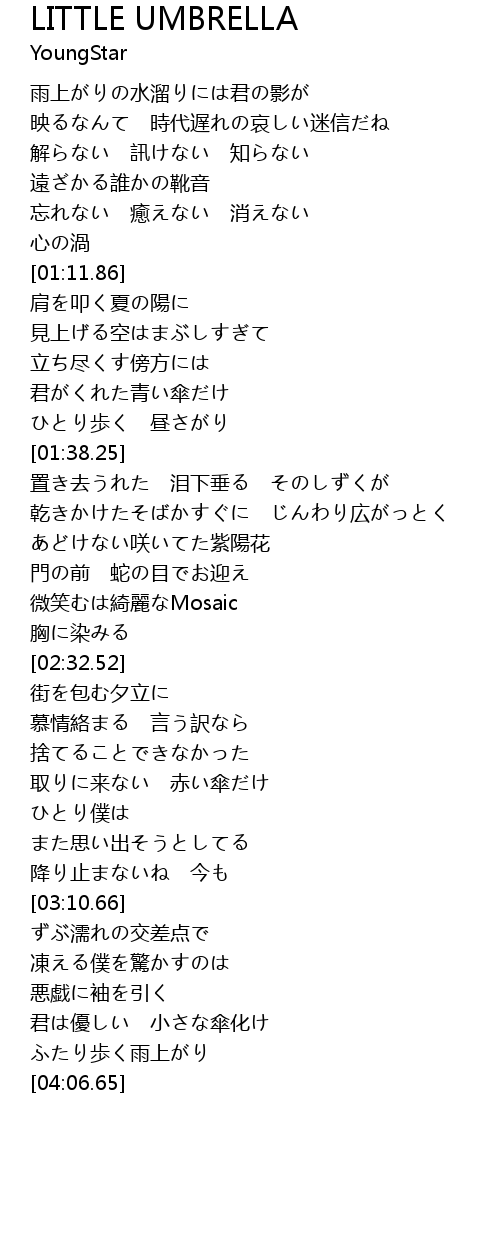 | [03:54.15] | 君は優しい 小さな傘化け |