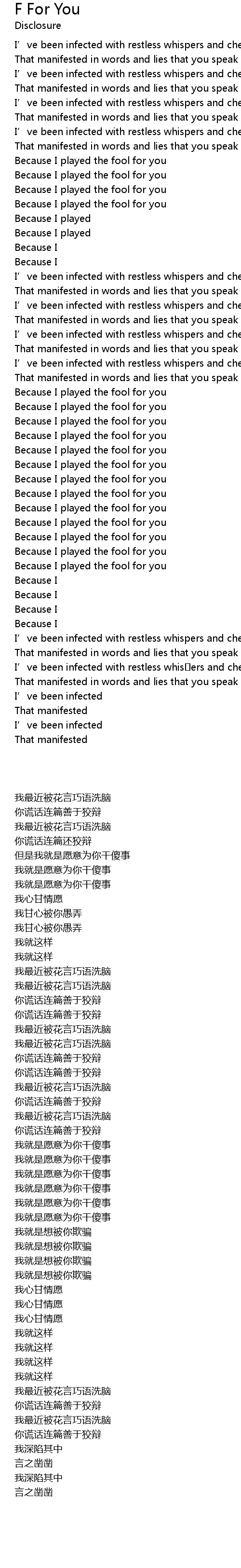| [0-1:47.790] | I' ve been infected with restless whispers and cheats |