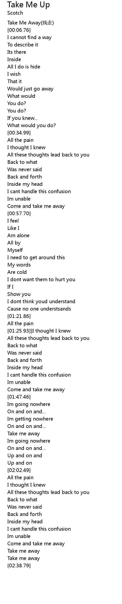 | [00:03.55] | Take Me Away wǒ zǒu |