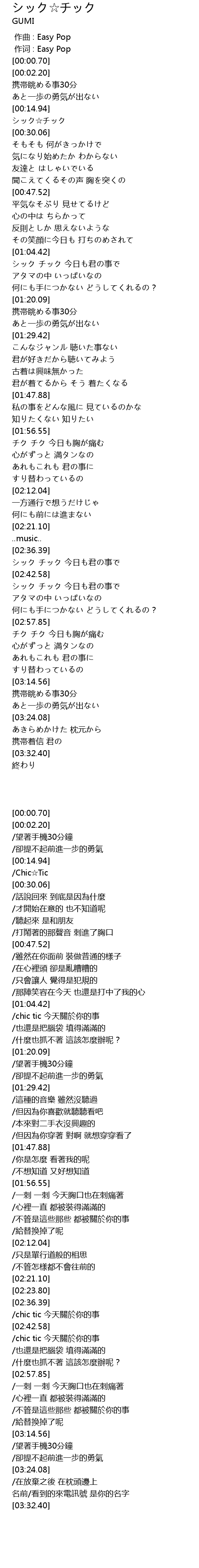 | [01:56.85] | チク チク 今日も胸が痛む |