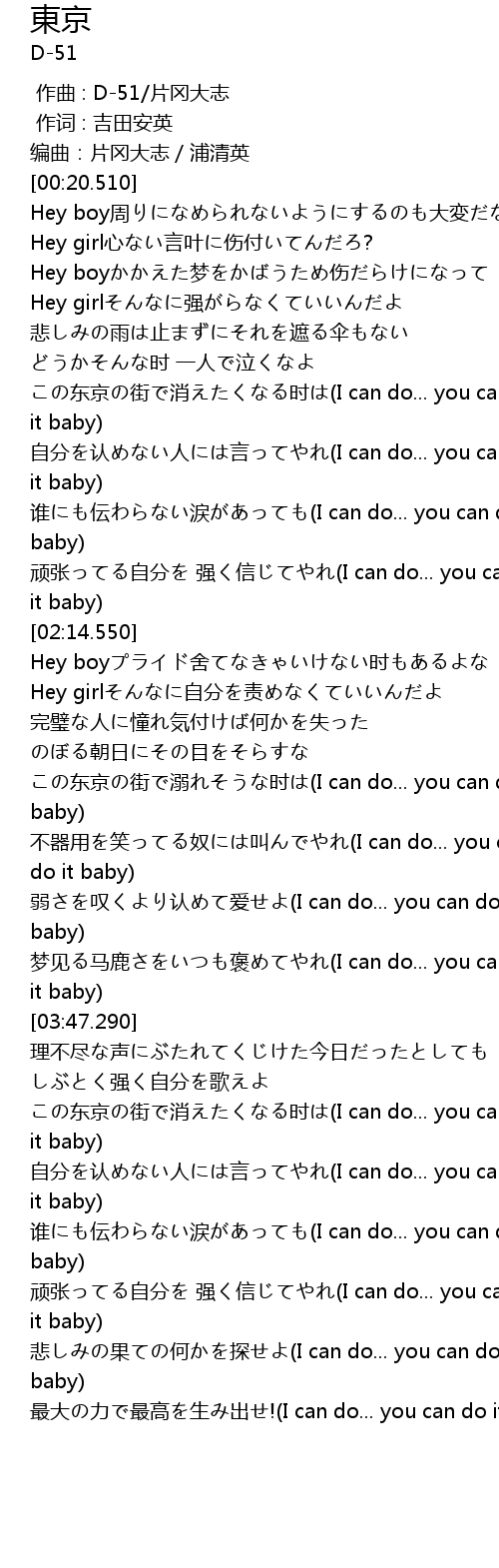 | [04:08.520] | この东京の街で消えたくなる时は(I can do... you can do it baby) |