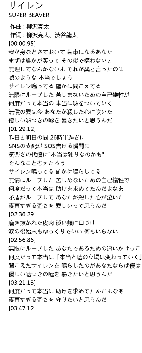 | [02:01.21] | サイレン鳴ってる 確かに鳴らしてる |