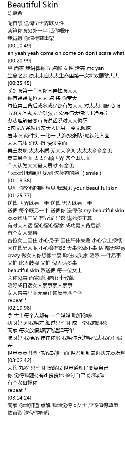 | [02:06.43] | beautiful skin xì sòng bǐ měi yī wèi nǚ shì |