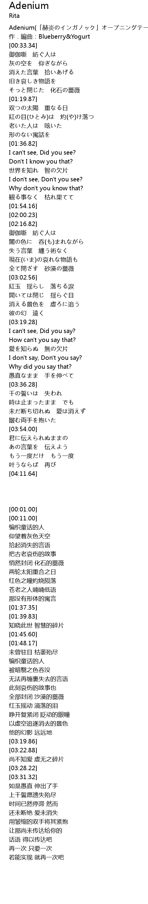 | [00:01.00] | Adenium(「赫炎のインガノック」オープニングテーマ) |